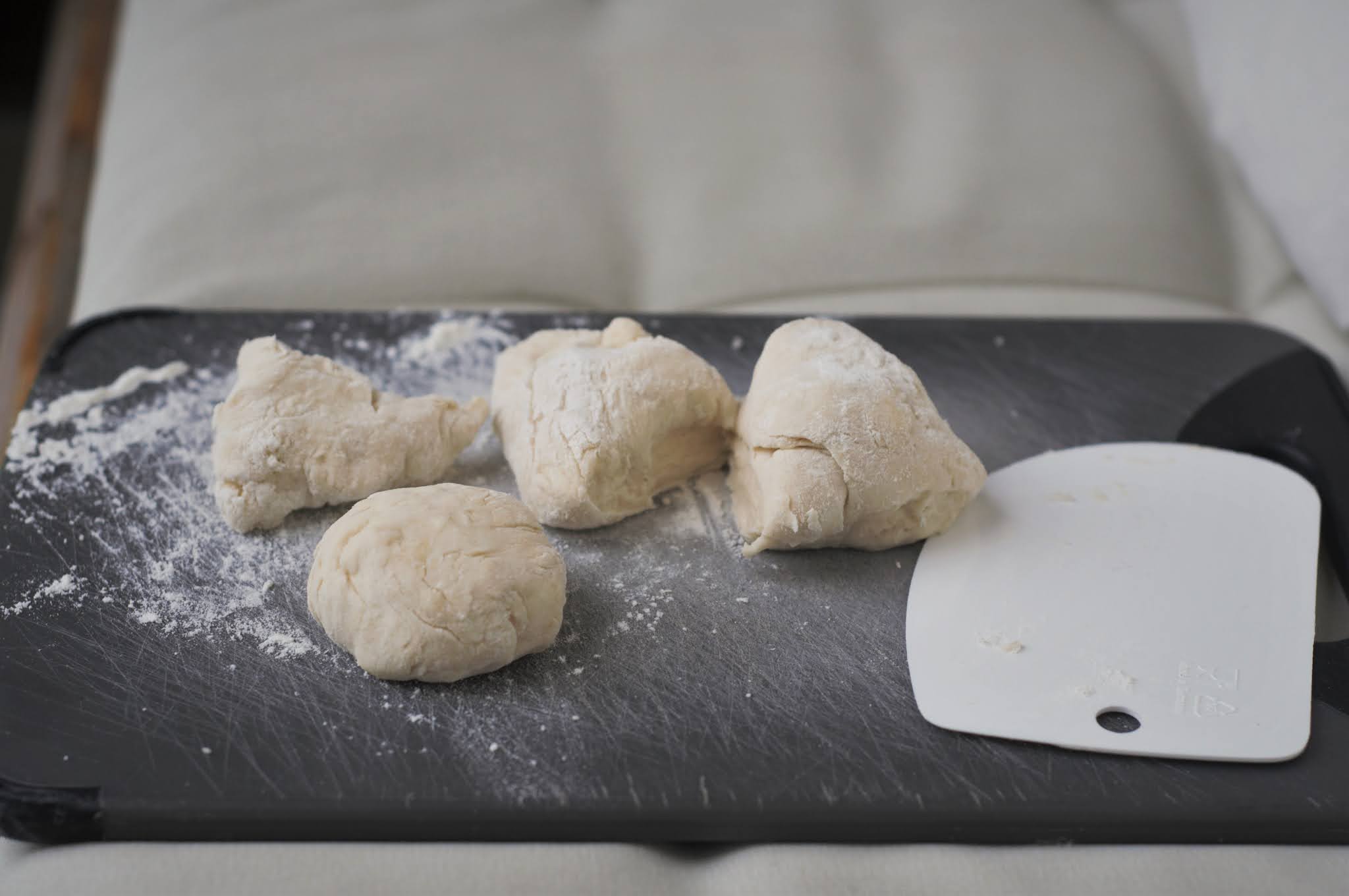 Apoi, îl tăiem în patru. Luăm câte o bucată, frământăm foarte puţin, presărând făină dacă este nevoie. Tăiem din nou în patru şi facem câte o bilă din fiecare a patra parte de aluat. Procedăm la fel pentru bucăţile mari de aluat rămase.